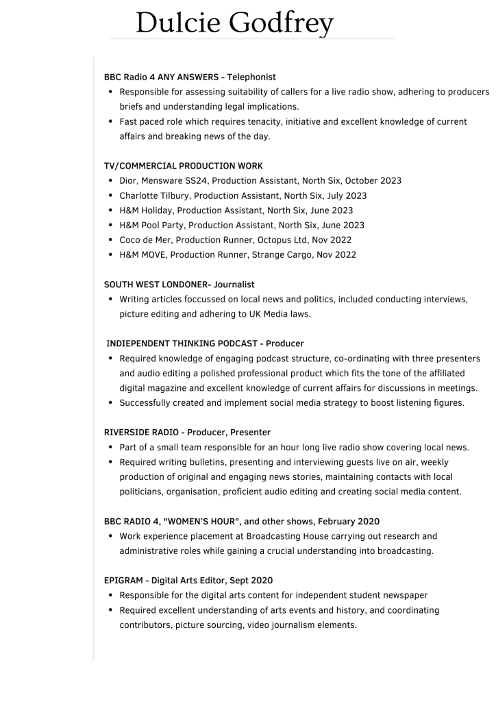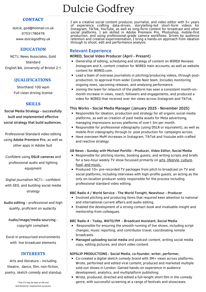Social Media Producer, Journalist, Video Editor, Broadcast Journalist, Radio/Podcast Producer, Writer, Comedy